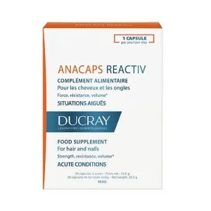 Anacaps Reactiv de Ducray est un complément alimentaire présenté sous forme de gélules et qui permet de redonner de la vitalité aux cheveux. Ce produit contient plusieurs sels minéraux et vitamines ayant des vertus nourrissantes et tonifiantes sur le bulbe capillaire.