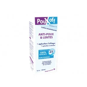 PouxOff Lotion assainissante exerce une double action physique, elle sattaque aussi bien aux poux quaux lentes, elle se fixe sur les orifices respiratoires des parasites, les étouffe, les déshydrate, et les tue. PouxOff Lotion assainissante a une action express, éradique seulement en 25 mn, 100% des parasites PouxOff Lotion assainissante est bien tolérée, elle est indiquée même pour lenfant a partir de 6 mois. PouxOff Lotion assainissante est une lotion douce pour les cheveux et la peau, sa formule non grasse, se rince facilement, et ne contient, ni insecticides, ni parfums, ni alcool.
